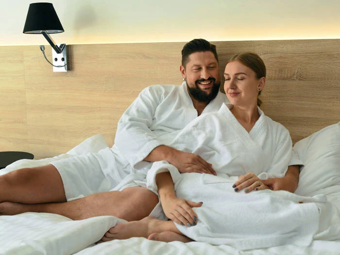- Mājīgs 33 m2 liels ģimenes numurs ar visām ērtībām, kas nepieciešamas atpūtai. Tas būs vienistabas numurs (guļamistaba, dzīvojamā istaba un virtuve) ar vienu divvietīgu vai divām vienvietīgām gultām, dīvānu, balkonu, TV, bezvadu internetu, drēbju skapi, gaisa kondicionieri, mini virtuvi ar ledusskapi, plīti, elektrisko tējkannu, tasītēm un citas ērtības, kas ietver mīkstu peldmēteli un čībiņas, lai Jūs sajustos kā mājās. Jums būs arī privāta vannas istaba ar dušu, tualeti, apsildāmu grīdu, elektrisko dvieļu žāvētāju, mīkstiem dvieļiem, tualetes piederumiem un matu fēnu.